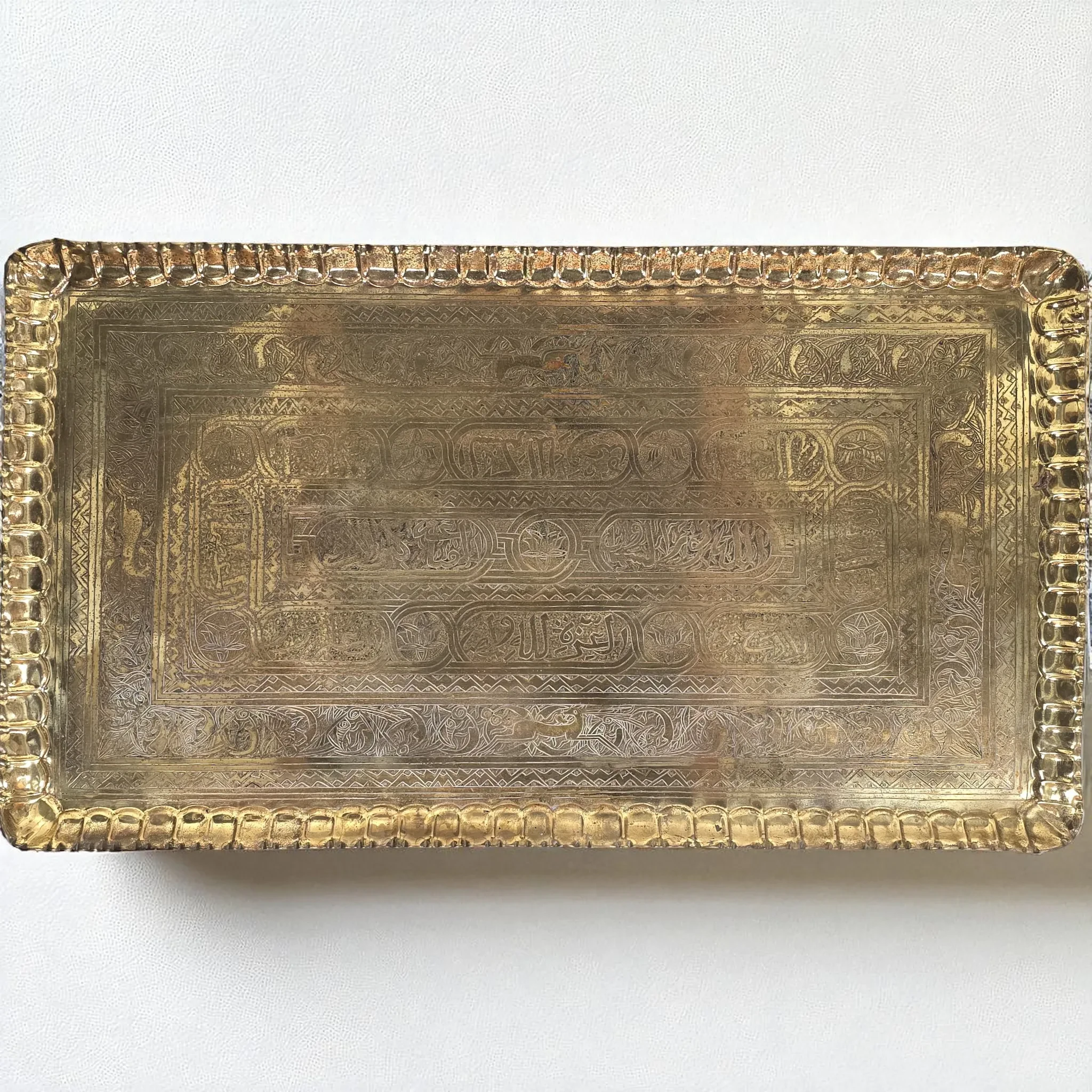 A beautifully hand-wrought and hand-chased rectangular brass tray featuring intricate arabesque decoration and elegant Arabic calligraphy. The center bears the Shahada (“There is no god but Allah, Muhammad is the Messenger of Allah”), while the top and bottom bands are inscribed with verses from the Ayat al-Kursi (Qur’an 2:255).