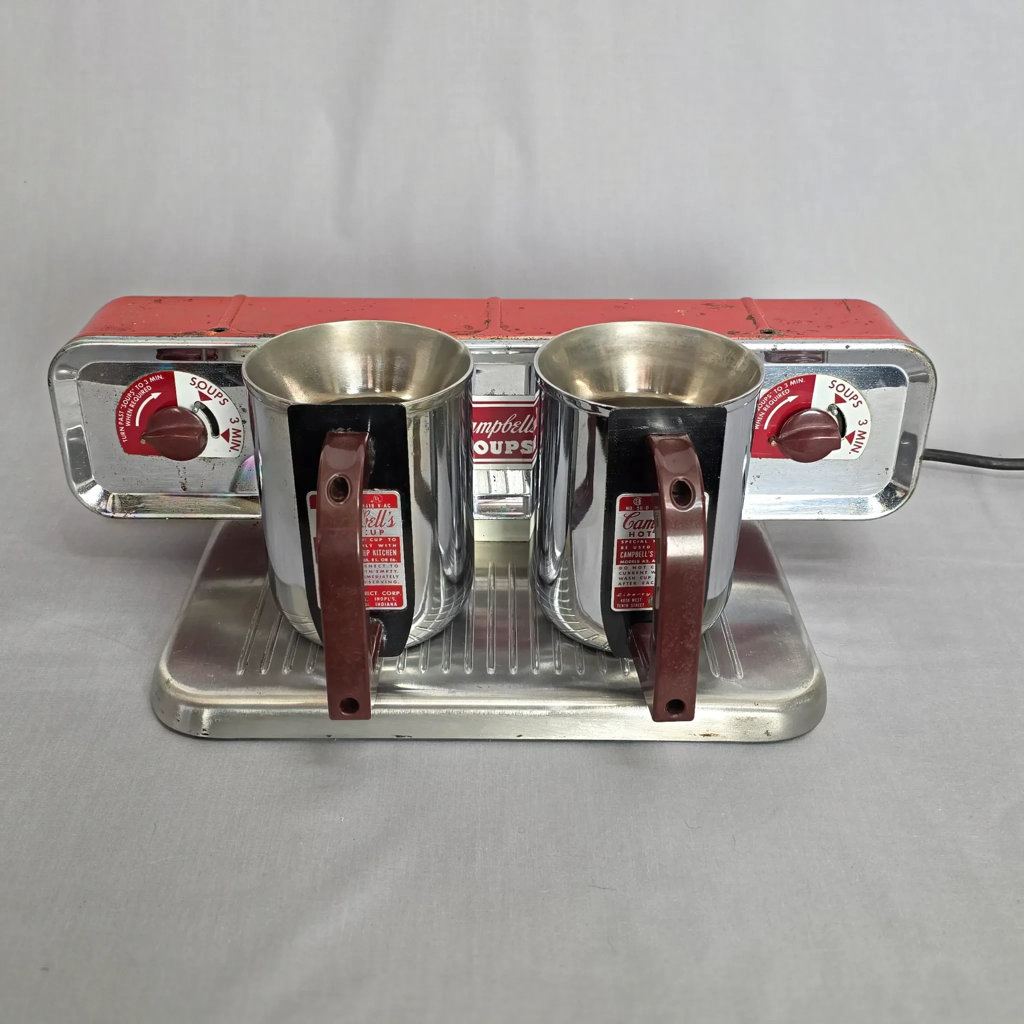 This is a classic piece of mid-century advertising memorabilia. Designed to heat two cups simultaneously, it features a chrome-finished body with the iconic Campbell’s Soups logo centered on the back panel, flanked by two original rotary heat controls.