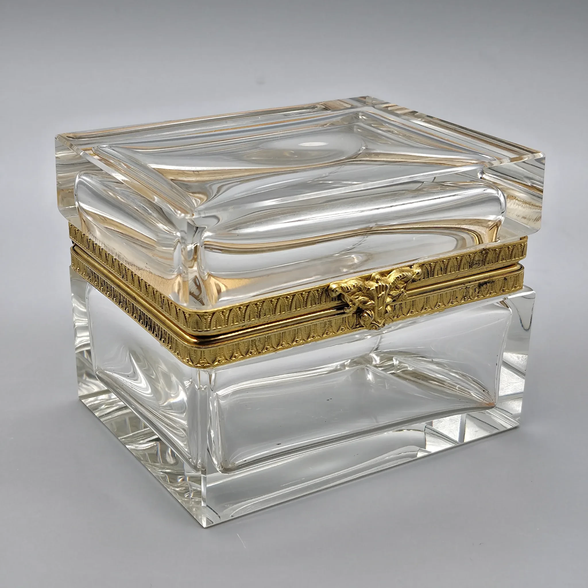 A refined mid-20th century French clear glass/crystal casket box, beautifully crafted with thick, highly polished glass and fitted with decorative gilt bronze mounts. The box features softly contoured interior walls that create exceptional optical depth, framed by a classical gilt bronze surround with a detailed foliate clasp and a smoothly operating hinged lid.